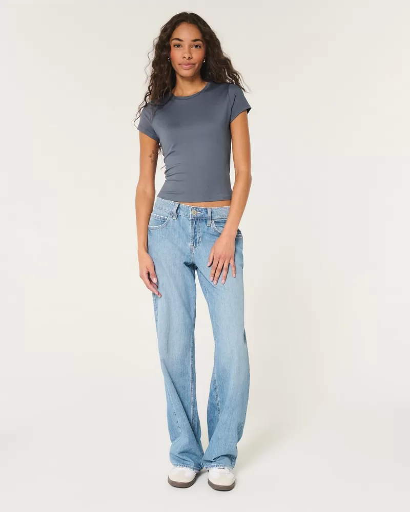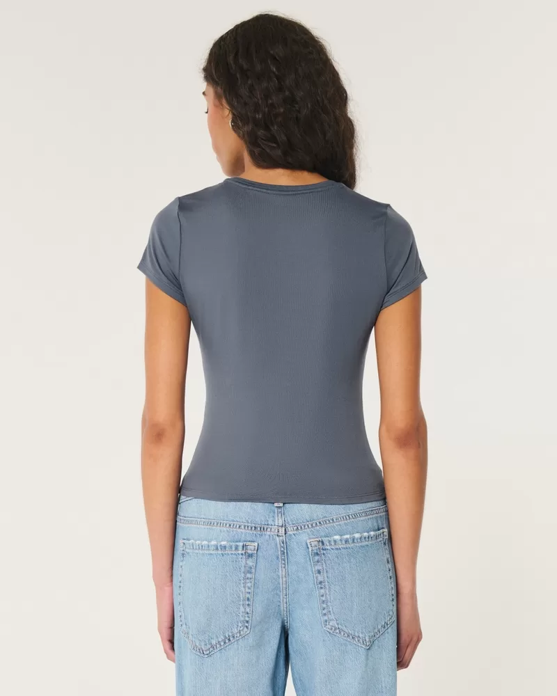 A comfy baby tee made with soft stretch fabric with a seamless look and feel. Crew neckline, short sleeves, longer length. Slim Fit.