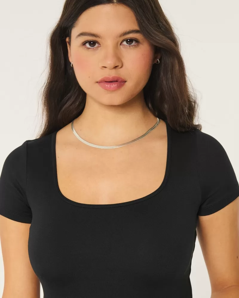 This comfy baby tee is made with super soft fabric with a seamless look and feel. Square neckline, short sleeves. Slim Fit.